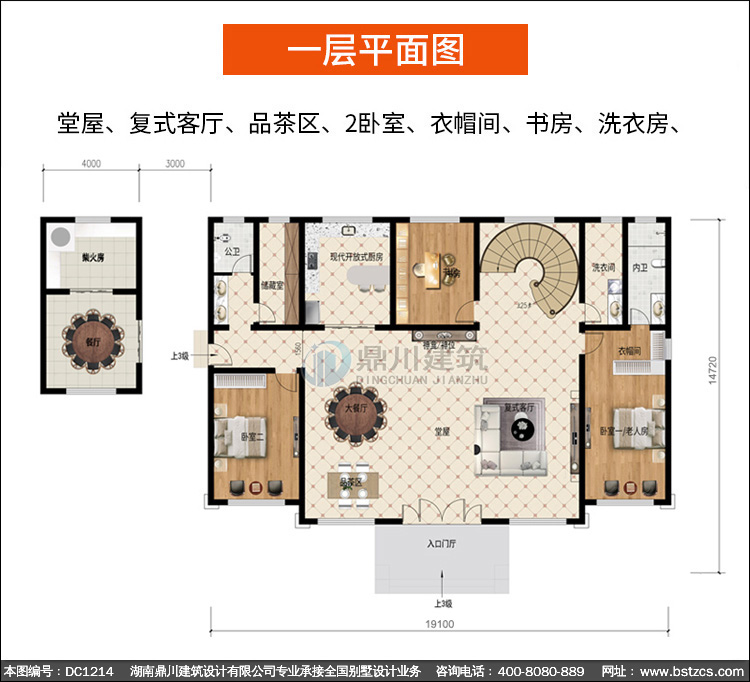 | 一 層: | 堂屋、復(fù)式客廳、品茶區(qū)、2臥室、衣帽間、書(shū)房、洗衣房、2衛(wèi)生間、儲(chǔ)藏室、開(kāi)放式廚房、柴火房、2餐廳 | |||