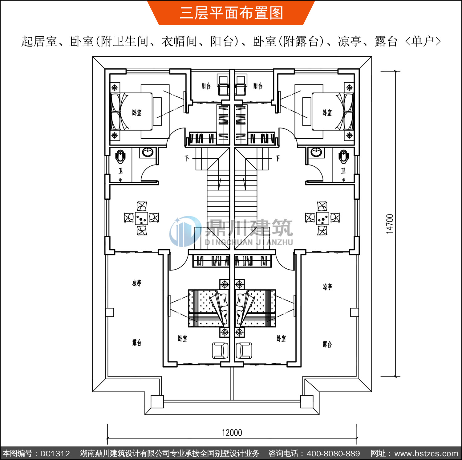 三 層: | 起居室、臥室(附衛(wèi)生間、衣帽間、陽臺)、臥室(附露臺)、涼亭、露臺 <單戶> |