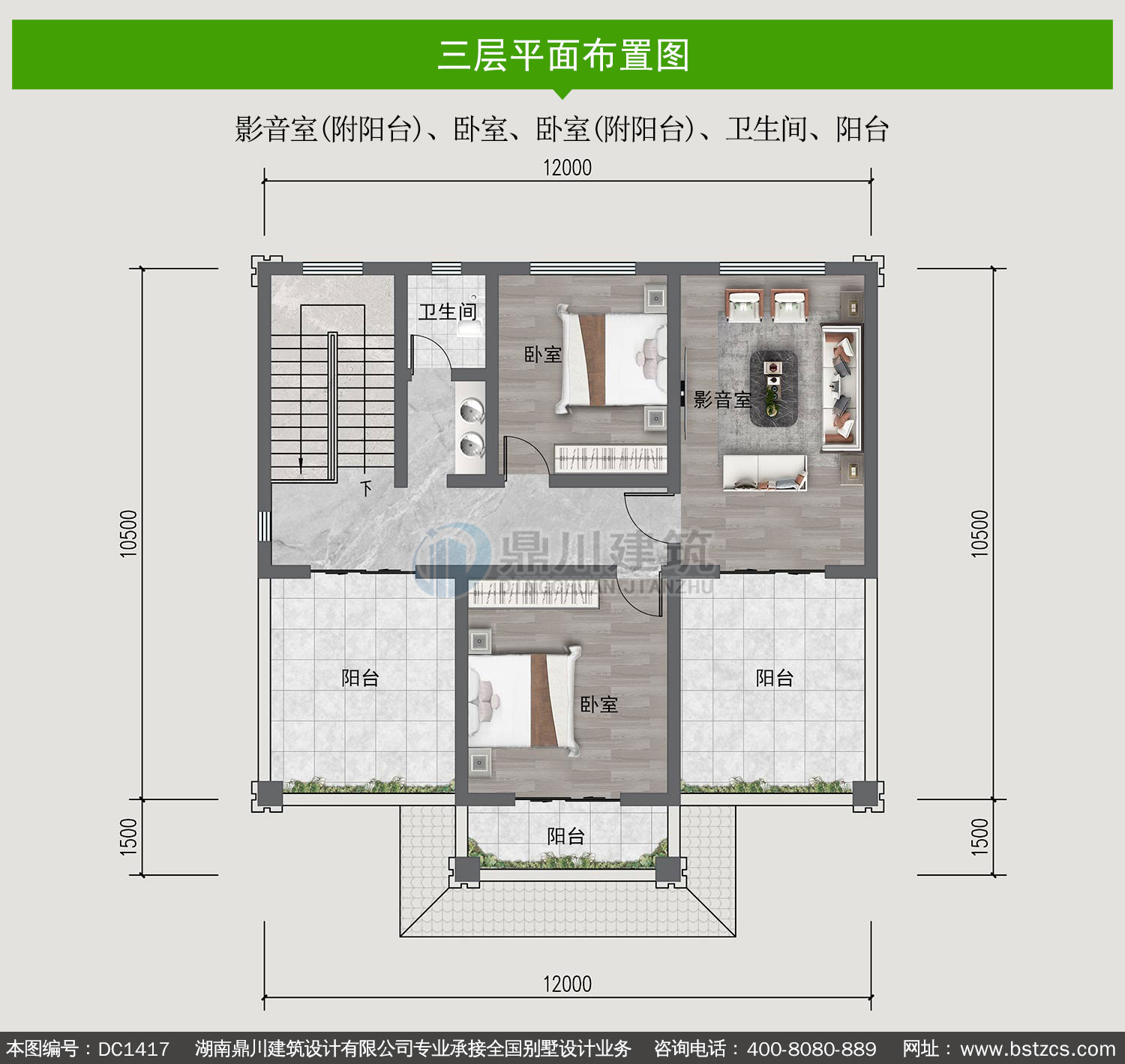 | 三 層: | 影音室(附陽臺)、臥室、臥室(附陽臺)、衛生間、陽臺 | |||
