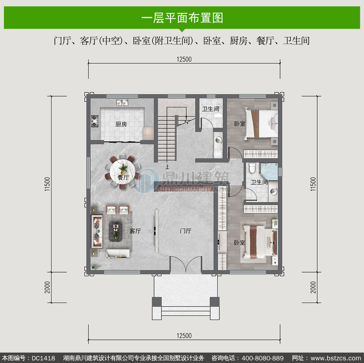 | 一 層: | 門廳、客廳(中空)、臥室(附衛(wèi)生間)、臥室、廚房、餐廳、衛(wèi)生間 | |||