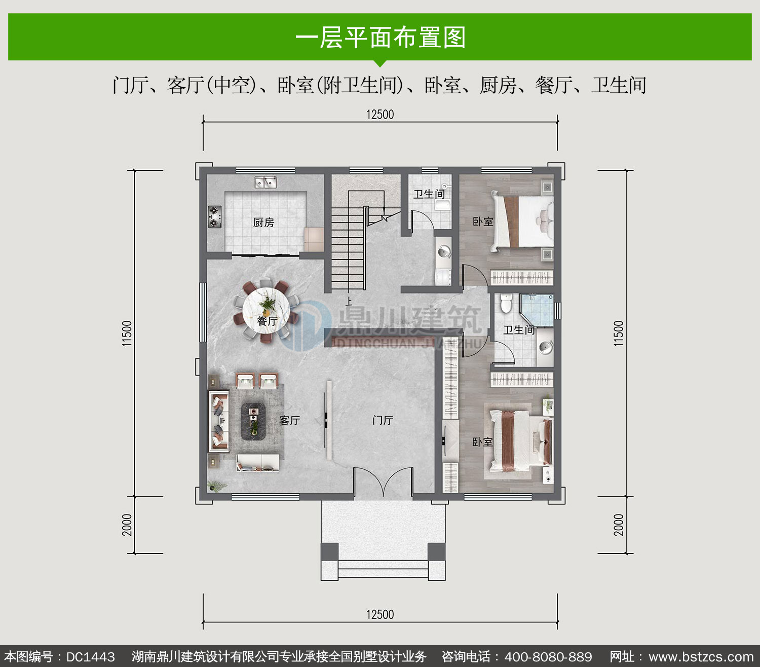 | 一 層: | 門廳、客廳(中空)、臥室(附衛生間)、臥室、廚房、餐廳、衛生間 | |||