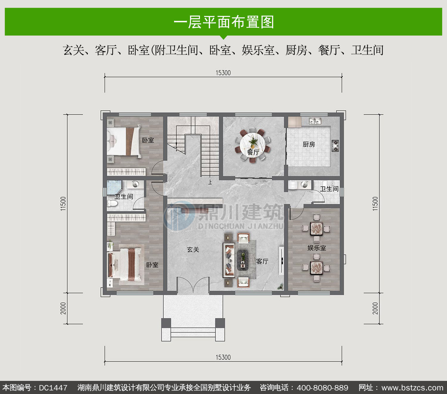 | 一 層: | 玄關、客廳、臥室(附衛(wèi)生間、臥室、娛樂室、廚房、餐廳、衛(wèi)生間 | |||