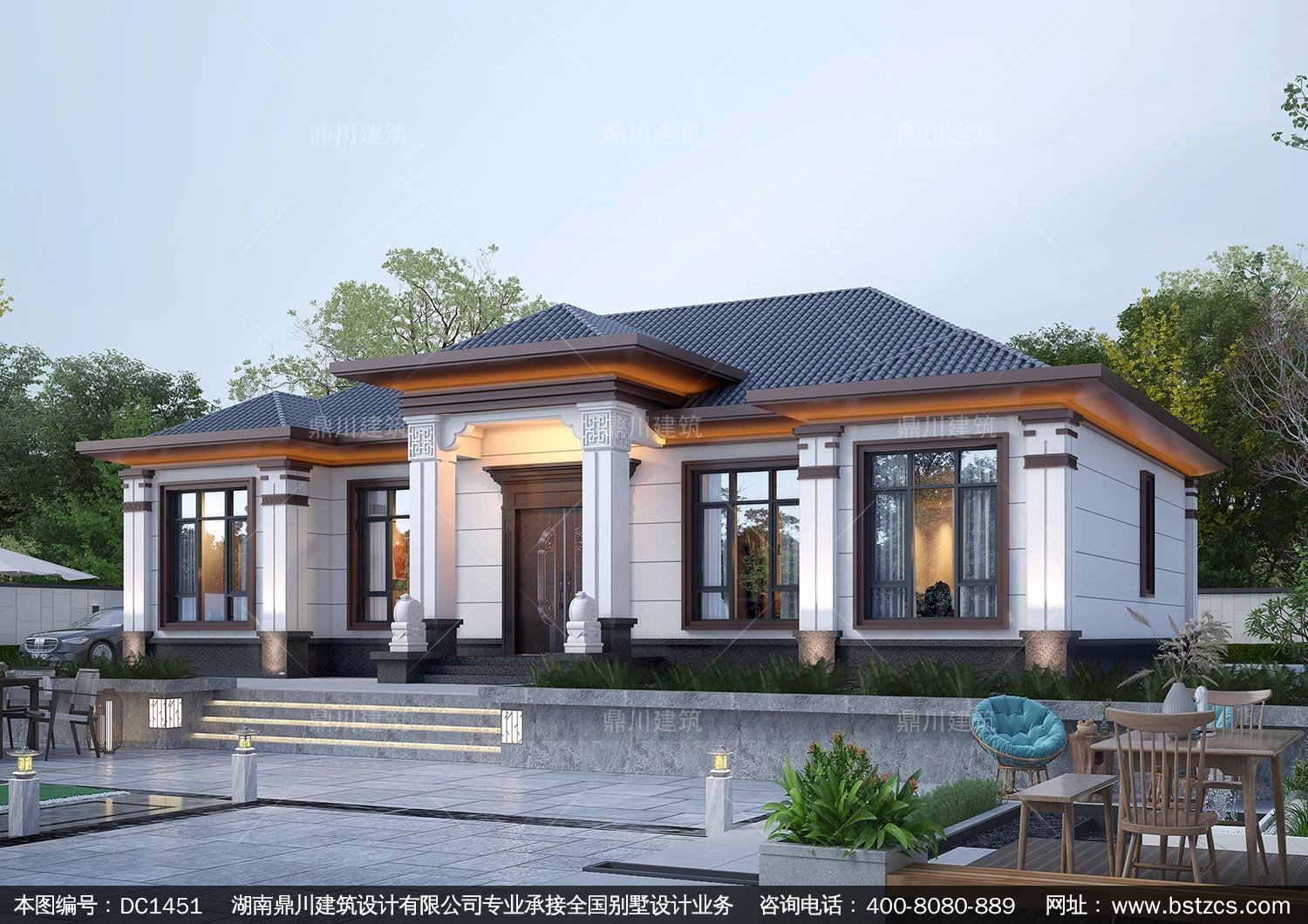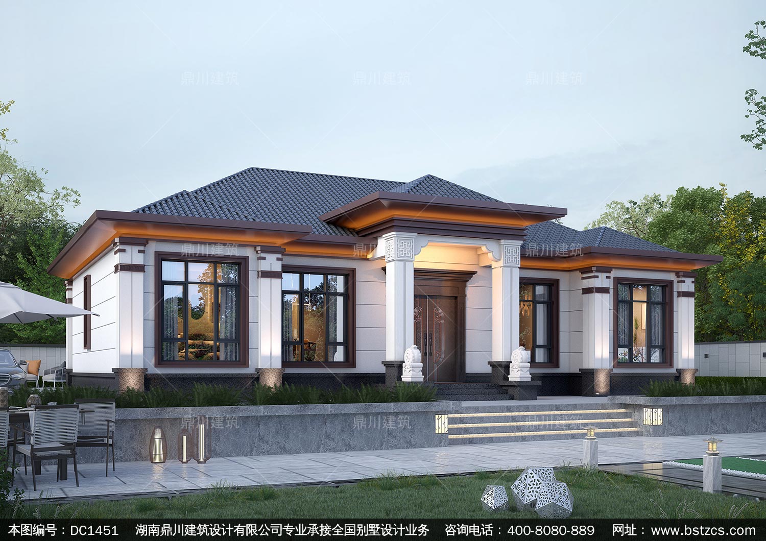 大氣新中式一層別墅設計圖紙及效果圖_農村自建房設計,鼎川建筑