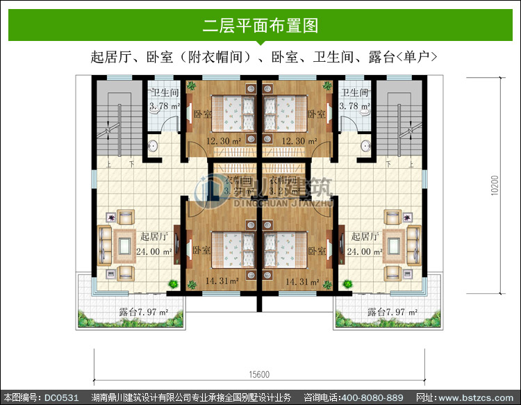 | 二 層: | 起居廳、臥室(附衣帽間)、臥室、衛生間、露臺 | |||
