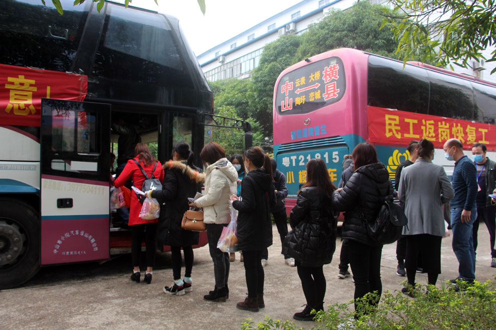 2月18日,總裁王咸車召開專題會(huì)議部署安排接員工返崗工作會(huì)議。人力資源部積極主動(dòng)同中山市、東區(qū)人力資源和社會(huì)保障局、中山市人力資源協(xié)會(huì)聯(lián)系對(duì)接資源和分享員工需返工信息。因廣西當(dāng)?shù)乜h、村還處于封路、封村的狀態(tài),員工出行還有層層要求和證明,縣交通也未恢復(fù),經(jīng)多方協(xié)調(diào),在中山市人力資源和社會(huì)保障局、廣西壯族自治區(qū)駐粵勞務(wù)辦事中山站工作站、廣西靈山、橫縣人力資源和社會(huì)保障局的溝通協(xié)調(diào)幫助下,第一時(shí)間積極協(xié)助香山股份復(fù)工復(fù)產(chǎn)打通資源,同一時(shí)間集團(tuán)人力資源部聯(lián)系交通運(yùn)輸單位承包了3輛大巴車赴當(dāng)?shù)亟訂T工返回。生產(chǎn)系統(tǒng)各分廠廠長(zhǎng)同一時(shí)間親自指揮聯(lián)系兩縣當(dāng)?shù)貑T工登記信息、聯(lián)系方式及建立返程微信群,終于確定在19日和20日車輛可以接員工返回中山。