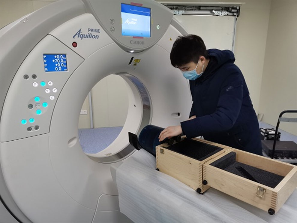 CT機是診斷新冠肺炎的利器之一,是快速篩查強有力的補充手段,同時還可以評估治療效果,其診斷結果是治愈出院的重要指標之一。在醫院現場檢測的近兩個小時里,雖然檢定流程輕車熟路,但一想到這份檢測任務是為疫情防控提供計量保障,每一次的肺部診斷結果都將關乎醫生的醫學判斷,于是檢定員們更加精益求精,專注認真地對儀器數值進行正確修正,確保CT機達到最佳的工作狀態。